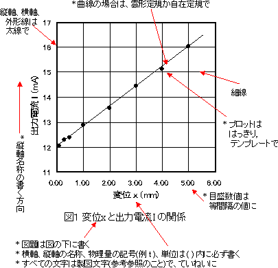 | 2つの量を両軸に取り、測定値を表す点を方眼紙にプロットする。そしてそれらの点の関係を最もよく適合する直線や曲線を引く。 縦軸と横軸の目盛りの取り方であるが、理想的には、測定値の有効数字の最後の桁の1が方眼紙の1目になるように選ぶべきである。しかし実際の場合は不可能な場合が多いが、有効数字全部を表現できるように心がけるべきである。 測定値を表すマークは小さいと見にくいので、○や×のマークも大きさは、1.5mm〜2mm程度が適切とされている。これ以下にすると、論文が雑誌などに印刷されるとき、縮小されるのが普通であるので見にくくなってしまう。学会誌などで発表されている論文の図面を見習って学習した方がよい。 |