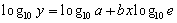 | プロットした点が y = axn (6) で表されるとき、両辺の対数を取り log y =log a + n log x (7) log y =Y, log a= A, log x=Xとおくと Y = nX + A (8) となり、直線になる。2つの量の間の関係が、常用対数を取ったとき直線的な関係にあるとき前式が当てはまる。両対数グラフ用紙にプロットすると直線が得られる。 nが正ならば、一般に放物線型、負なら双曲線型となる。式(8)に,ΣΔ法やx,yを対数に変えてから後に述べる最小二乗法を適用すればn,Aを求めてから、n,aが得られる。 |
