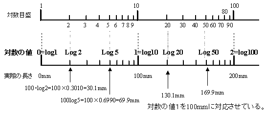 | 対数の値は、log1=0、log2=0.3010、log3=0.4771、log5=0.6990、log10=1、log100=log102 =2log10=2、log1000=log103=3であるので、対数目盛と実際の長さは図のようになっている。従って、対数目盛の数値のところに点を取れば、常用対数の値になっている。 下の図では、対数 log 10 = 1を長さ100mmに対応させて表している。 |