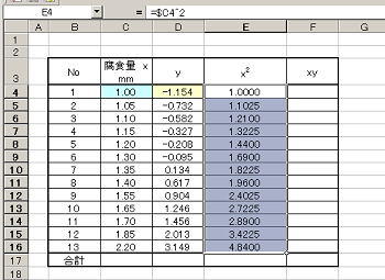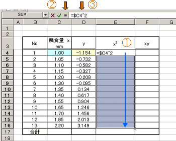 | @E4からE16までドラッグ A "="をクリック B "="の次に、数式 $E4^2