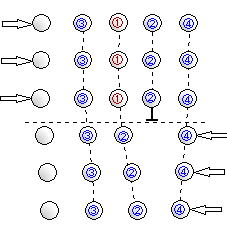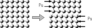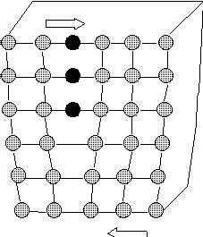 | このような不自然な状態にあるところに、せん断応力を受けると,転位の左側の上面の原子は,下面の原子に対して引力(お互いに遠ざかる)を受け動く,転位より右側の上面の原子は,下面の原子に対して反力(お互いに近づく)を受けて動く。反力と引力は打ち消し合ってほぼ0になる。 けっきょく,対になっている上下、2原子間の結合を切るのに必要な大きさのせん断力τは小さなものになり、わずかのせん断応力を与えれば,転位(余分な原子面は)は簡単に1原子間隔だけ右に移動することになる(付図C.10)。これを結晶の端から他端まで1原子づつ、順次繰り返すと結晶は1原子だけすべったことになる。式(C.2)では,一度に全部の原子の結合が、切れるとして計算した。転位を移動させるのに必要なせん断応力τは、欠陥のない結晶を移動させるのに必要なせん断応力τcの大きさよりかなり小さくなることが理解できる。 |