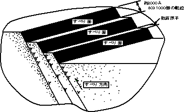 単結晶に引張り荷重を加え,徐々に荷重を大きくしていくと,軸方向と45度をなす面上の最大せん断応力も大きくなる。結晶構造によってすべることのできる面(すべり面)と方向(すべり方向)が決まっていることは前に述べた。多結晶の場合、各々の結晶粒はすべり方向が異なり、最大せん断応力方向に近いすべり面上の転位が,移動可能な大きさのせん断応力に達すると,まず,すべり面上を移動を開始する。転位は増殖されその数を増す。1個の転位が結晶の端まで達すると1原子間隔分のずれ(すべり)が生ずる。多数の転位が通過した場合は転位の数の分だけのすべり量が生ずる。すべりが生じた結果,金属表面にはすべり線と断層ができる。これが『金属のすべり変形』である。 |