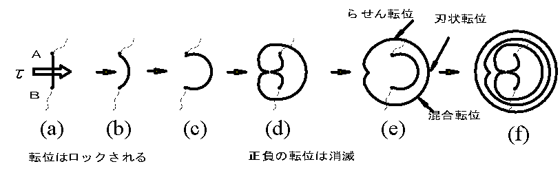 | 両者が合体すると正負のらせん転位は消滅しループになる。この現象が繰り返され、小さな外力によって、同一すべり面上に多くの転位が生成される。この現象を転位の増殖機構、ABをフランク・リード源と言う。付図C.13には、転位ループの断面図を示した。 |