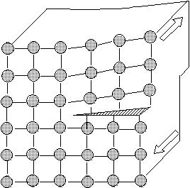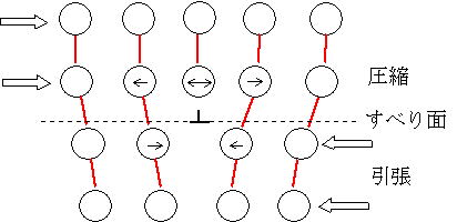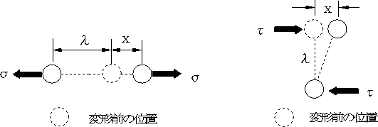 | 結晶格子の変形は基本的には付図C.3、付図C.4に示すように、引張変形とせん断変形の2つである。原子と原子の間に働く力は、正常な間隔を保っているときには0であるが、外力が加えられこの格子間隔が変化すると反発力や引力が生じる。 |