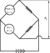 | 電気抵抗Rは細線の断面積A,長さL,比抵抗ρのとき,R = ρL / A で表される。貼り付けた材料が荷重を受けて長さがΔLだけ変形すると貼られたひずみゲージは材料と共に引き伸ばされるので抵抗値はΔRだけ変化する。 ΔR/R=k・ΔL/L この抵抗値の変化をホイーストン・ブリッジ回路で検出し増幅すると材料のひずみe= ΔL/Lが分かり,材料のヤング係数,断面積から作用している荷重Pの大きさが測定できることになる。 P=σ・Ao=(E・e)Ao=E・(ΔL/L)・Ao ひずみゲージは変位センサーであり微小な変位,ひずみの測定に用いられ,これらを応用して,重量,力や圧力も測定することができる。 このように、力は直接測定することはできないので、変位や伸びを測定して、フックの法則から力や荷重に換算することになる。バネ秤を見ればわかるように、伸びの大きさに応じて目盛りが記されている。 |