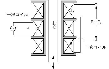 | ■ | 差動変圧器 伸びの測定 図5に示すように,円筒形のボビンの中央に一次コイル,その両端に,二つの二次コイルを巻き,それらを図のように結線すると,コイルの中心の棒状の鉄心がコイルの中央にあるとき,2つの二次コイルに発生する交流誘導電圧は互いに打ち消しあって0であるが,鉄心が中央の位置から変位すると,一方の二次コイルの電圧が大きくなり,変位に比例した差の電圧が生ずる。このように鉄心の変位を交流電圧の大きさとして測定する装置を差動変圧器(差動トランス,differential transformer)と言う。一次電圧として,10V程度の周波数50Hzの交流電圧,感度を上げたいときは,数百〜数千Hzの交流を用いる。分解能は1μm程度のものまである。測定範囲も数十mmのものまである |