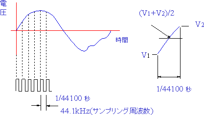 | 最近は,計測器がパソコンを内蔵しているか,計測器をパソコンにつないでデータを記録することが一般的に行われている。計測器やセンサーなどからパソコンに取り込む場合に必ずAD変換(アナログ量からディジタル量に変換)している。このための専用のボードが市販されている。 以下,16ビットの場合に,アナログ電圧をディジタル量に変換する方法について述べる。 図6ではアナログ電圧を,44.1kHzでサンプリングし,ディジタル量に変換する場合を示している。サンプリング周波数44.1kHzのとき,1/44100secの間に,電圧測定,データ送信を行う。実際は,サンプリング周波数の半分程度の時間における最初と最後の電圧V1,V2の電圧を測定し,平均値を取り込む。 |