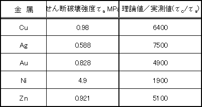 | ■理論計算値と実測値の大幅な相違 せん断強さτcの実測値は,理論値の1/100〜1/1,000になっている。この差は何から生ずるか? 理論計算では,結晶格子は理想的に完全な状態,格子欠陥などの欠陥がないことで話を進めてきた。実際は,格子欠陥,空孔や介在物による欠陥が多く含まれ,それらによる応力集中効果によって外荷重は小さくとも,材料の内部では大きな応力が生じ,σc,τcを軽く越えると言うことが起こるからである。種々の欠陥の中で,特に結晶格子の面状の欠陥である『転位(dislocation)』が材料の強度に大きな影響を及ぼす。 |