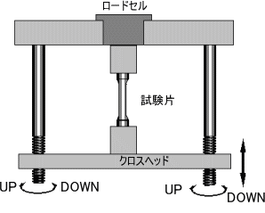 | 引張試験(tensile test)では、試験片を時間的に一定な割合(例えば,10mm/min)で引き伸ばし,伸びとその伸びを試験片に引き起こすのに必要な荷重(材料の抵抗力)を試験片が破断するまで連続的に測定し,記録します。このようにして得られるのが荷重ー伸び曲線です。図2.1に引張試験機の概要を示します。図2.2には低炭素鋼(炭素0.18%程度と鉄の合金,構造用鋼)の荷重ー伸び曲線を示します。 OからA’までは直線であり,荷重と伸びはフックの法則に従い,比例します。たいていの材料は,伸びが小さい場合はフックの法則に従う部分を有します。A’は直線の限界点で比例限度(proportional limit)です。A’からAまでは曲線となりますが、A点の荷重値より小さい値から除荷した場合は、もとの長さにもどります。A’点とA点の位置はほとんど差がなく、計測器の精度に影響されます。A点に達すると荷重は急激に減少し,Cまでは,荷重の多少の増減はあるが,ほぼ一定の大きさの荷重(ほぼ同じ大きさの抵抗力のもとで)で伸びだけが進行する現象を示します。 |