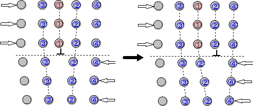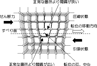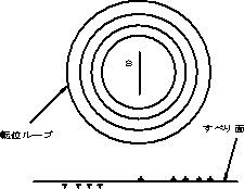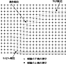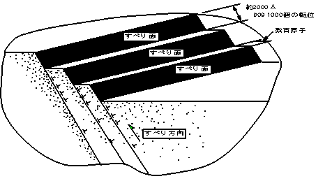 | 転位の周りの応力(力)の分布状態から、かなり小さい力あるいは,エネルギーで移動できる。1原子間距離の移動を順次繰り返し,転位が結晶の端まで移動して抜ける.結果的に結晶全体が1原子間距離のすべりが生ずる. |