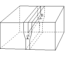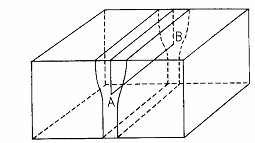 | ◆欠陥のない材料の 1/7500〜 1/1900の強さ 「 転位のような欠陥の存在がすべり強度を大幅に減少させる」 Taylerと Orowanが1934年,欠陥のない材料と実用材との強さの大幅な相違の説明のための理論として転位のモデルを提案し,その後,実験的に透過型電子顕微鏡により転位が観察された。以来、金属に関するいろいろな現象は,ほぼ転位で説明できるようになりました。図2.19においてABが転位線で,電子顕微鏡では 転位の中心がゆがんでいるため、転位線の近傍が黒い線となって観察される。 |