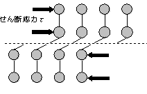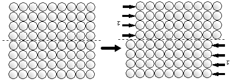 | 2.5.6 転位などの欠陥がない、理想結晶のすべり変形 図2.12に転位などの欠陥が全くない場合のせん断応力τが作用し,破線を境界とする原子の結合が全部切れ,1原子間距離だけ移動した場合を考えます。 |