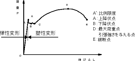 ![]() 図2.2(a) 引張試験で得られる炭素鋼の荷重−伸び曲線 |