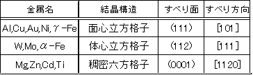 | 金属の変形の仕方はすべり(slip)と双晶(twin)以外にありません。この現象について述べます。 2.3.1 すべり(slip)による変形 カードが崩れるように,ずれることによって変形することをすべりと言います。この現象については後に詳しく述べますが、結晶のすべり面とすべり方向は決まっていて、他の面上や方向にはすべることができません。表1に示します。 |