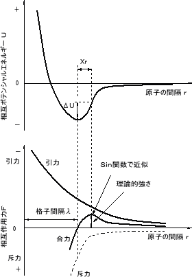 | ■2つの原子間に働くポテンシャルエネルギーUと力F 図2.17で説明のように,2つの原子間に働くポテンシャルエネルギーUと力Fは量子力学や化学の分野等で次のように求められている。図2.25は2つの原子間に働く相互作用力Fについて示した。引力と斥力が釣り合うところ(合力F=0)が原子間隔となる。外力を加えて原子を引き離すためには、合力Fに逆らって外力を作用させる必要があり、最大値を超える(図の理論的強さ)と結合は切れることになる。この部分の曲線をSin関数で近似して理論的強さを計算する。 |