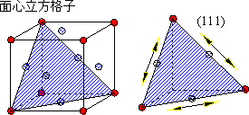 | 面心立方格子の場合、 (111)面に6個の原子,密に詰まって,隣の原子との距離小→移動の際、小さいエネルギーですみます。 |