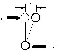 | ■せん断の場合 外応力τが大きくなり、 最大値τcを越えたとき原子は隣の位置に移動.1原子間距離のすべりが生ずる。 τ=τcsin(2πx/λ) 近似式として次のように求められている。 τc≒G/2π τc:理論的せん断強さ、 G :剛性率,横弾性係数 |
