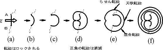 | ■転位の増殖機構 (a).転位線ABはすべり面上,その他の転位線はすべり面以外で、移動不可。A,Bで固定されている。 (b),(c).そのため、せん断応力を受けるとAB部の転位は輪のように変形。さらに大きく なり、 (d).左巻,右巻のらせん転位が出会うと消滅し、 (e).独立したループが生成される。 (f).この過程が繰り返えされ、ループが次々生成され、多重ループとなる AB:フランクリード源と言う。多数の転位が発生する源。 |
