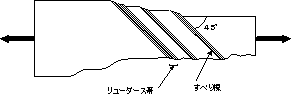 | このAーCの現象を降伏(yielding)と言い、低炭素鋼の特徴です。A点を上降伏点(upper yield point),比較的平らな部分の中で一番荷重の低いB点を下降伏点(lower yield point)と言う。A点はすべり(slip)の開始点であり,試験片のR部の細い部分から,すべりが発生し,その結果,C点にいたるまで帯状の筋(リューダース帯、すべり線の集合体)が試験片全体に広がることを示しています(図2.4)。一般に形状が変化する部分では、応力集中(後に解説)のため、形状が一様な箇所より応力が高くなるので,すべりはここから発生し,すべりの方向はほぼ最大せん断応力方向(荷重軸方向とは45゚をなす)です。低炭素鋼は多結晶であるので、実際の現象は図よりも複雑です。 OAは弾性変形で力を取り除くと元の長さに戻る変形をしており、A点以降は塑性変形で力を取り除いても元の長さに戻らず,永久のびが残る変形です。ほとんどの材料は,変形が小さいうちは,弾性変形,大きくなると塑性変形を示します。ガラス,セラミックスなどは弾性変形のみで,比較的もろい材料です。 |