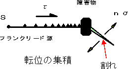 | 大量に発生した転位は,結晶境界,転位などの障害物により動きを止められ集積する。 この箇所に,局部的に大きな力が集中し,材料の強さを減少させる。低温脆性破壊などにおいては、図2.24の割れ(Crack)が破壊の起点となりうる。結晶粒径が大きいと、集積する長さ(範囲)が大きくなり、集積する転位も多くなり、結果として応力集中が大となり、強度を低下させる(降伏応力、破壊応力の結晶粒大きさの依存性にも関係)。 |