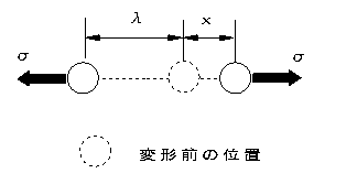 | ■引張の場合 2つの原子をxだけ引き離すのに要する応力σは次式で近似され、最大値σcを越えたとき、原子間の結合が切れ、破壊が生ずる σ=σcsin(2πx/λ) σc:理論的引張強さ λ:格子間距離 近似式として次のように求められている。 σc≒ E/10 E:ヤング係数 |