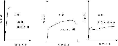 ![]() 図2.3 材料によって異なる応力−ひずみ曲線の形状 |