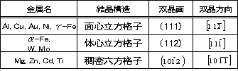 | 2.3.2 双晶(twin)による変形 ある面を境にして,結晶格子が対称にずれる変形で図2.5に示します。双晶面と双晶方向も金属により決まっていて、これを表2.1に示します。波線の矢印のように原子が移動し、双晶面に対して、原子の並び方が対象になるように変形します。 |
