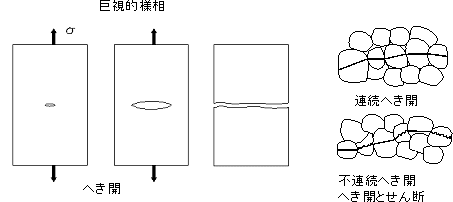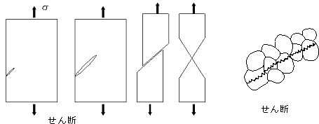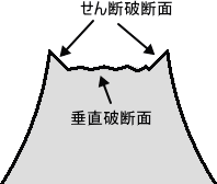 ![]() 図4.1 へき開型あるいは引張型破壊 図4.2 せん断型破壊 |