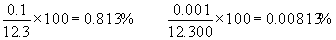 | また,例1と例2を比較すると,数学的には同じ値であるが,測定値の場合は意味が異なる。例2の12.3 mmにおける「3」は目分量で読んだ結果であり,「2」は,最小目盛りの位置を表すので,1 mm の最小目盛りを有する測定器(例えば物差し)で読んだことになる。例3の12.300 mmにおける最後の「0」は目分量の読みの結果ちょうど「0」であり,その前の「0」は最小目盛りの位置を示し,0.01 mmの最小目盛りを有する測定器(例えば,マイクロメータ)を用いたことを示している。誤差は、最小目盛りの1/10より小さい値となる。 誤差百分率は分解能を測定値で割った値で、1.23と12.300場合は下記のようになり |
