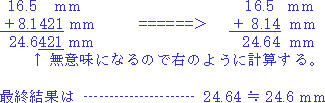 | 有効数字が多いほど、分解能が高いほど、誤差の入る割合は小さいことがわかる。 (2).測定値どうしの計算 有効数字の異なる2つ以上の測定値を用い,計算してある量を得るときの有効数字の扱い方である。 利害関係のある場合は,JISで取扱いが定められている。ここで示す方法は便宜的なものである。 ●加減の計算 小数点以下の有効数字の桁数を揃えるようにする。小数点以下の有効数字の桁数の最小のものより一つだけ多くとって計算し,最終結果は測定値の中で小数点以下の有効数字の桁数の最小のものに揃える |