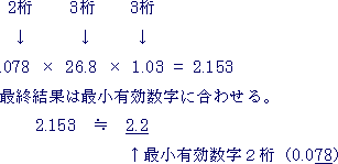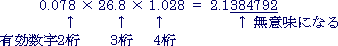 | *0.078の有効数字は2桁で、3桁目は読むことが不可能。読めない値が384792に入っている。試しに,読むことが出来なかった有効数字3桁目を9とおき,0.0789として計算してみる。 0.0789 × 26.8 × 1.028=2.1737266 となり,有効数字3桁目は,7に代わっている。読めないはずの9が影響していることになる。このような意味で384792は無意味な数字と言うことになる。計算結果は,有効数字の小さい測定値(誤差百分率が大きい測定値)に影響を受けることがわかる。 次のように計算する。 ◆最小有効数字: 測定値の内の最小有効数字に着目,他の測定値はこれより1桁多く取って計算 |