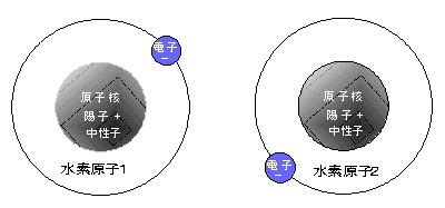 | 2つの原子の間に作用する力とポテンシャルエネルギー(位置によって変化するエネルギー)は,次のようになる。原子が引き合う力,引力は各電子は他方の陽子から引力を受けるにより生ずる。これに反し,反発する力,斥力(反力)は次の(1), (2)によって生ずる。 (1) 2個の電子の反発 (2) 原子核の陽子の総合反発 |