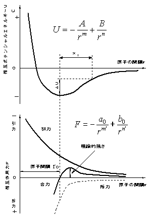 - Morse curve)と言われている。 結晶性物質において、加えられた外力が作用して、一次結合(イオン、共有、金属結合のいずれの場合も)の復元力が生ずることを図1の原子間距離と相互作用力の関係曲線は示している。 |