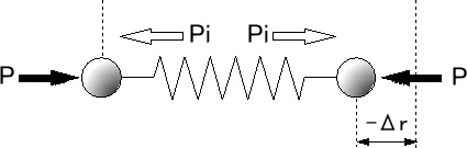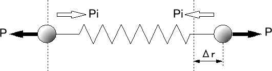 | ●圧縮の外力Pが作用する場合 原子間距離をro−Δrとなり、元の位置roに戻そうとする復元力Piがバネの内部に生ずる。引張りの場合と同様で、復元力の向きが異なるだけである。 |