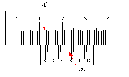 | @副尺の0点が指す主尺の値を読む。図5の場合12。A次に、副尺と主尺の目盛りが一致する副尺の値を読む。図では5.5の値。この値が0.1mmの位の値に相当する。測定値は、12+0.55