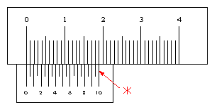 | けっきょく、副尺の0点が示す値、主尺の読みの値は、副尺の目盛りと主尺の目盛りが一致する4、すなわち、0.4mmと言うことになります。他の値についても同様です。 一般のノギスは、副尺の長さは19mm、20目盛りを有しますので、1/20mm,0.05mmまで読むことができます。0.05の分解能になります。 |