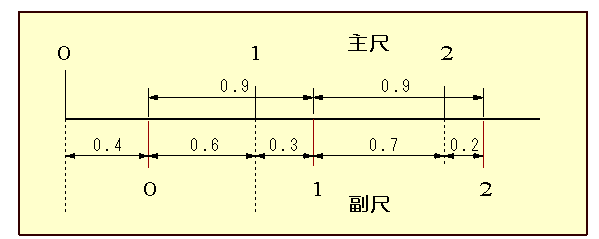 | 次に、図8のように、副尺の目盛り0を0.4mmタだけ右にずらす位置にします。副尺の目盛り間隔は0.9mmであるので主尺と副尺の1の目盛りは0.3mm、2の目盛りは0.2mm、3の目盛りは0.1mmのずれを生じ、4の目盛りは0mmで一致します。5の目盛りは、0.1mm,6の目盛りは0.2mmとずれは増加してゆきます。更に詳細を図9に示します。 | ||||||||||||
