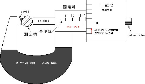| ● | マイクロメーターの構造 図1にマイクロメーターの概略を示す。U型の枠の一端にアンビル(anvil)が固定し、測定物が当たる。スピンドル(spindle)は、シンブル(thimble)を回転させることにより移動し、測定物に接触する。測定圧を一定にするためにシンブルの右端にラチェットストップ(rathed stop)がある。測定の際に、これを持って回転させると測定物にスピンドルが接触し、ある程度の圧力に達すると空回りし、スピンドルは移動しないようになっている。通常のマイクロメーターの測定範囲は25mm、最小目盛りは1/100mmである。最近はディジタルの表示器付きのものもある。 |
