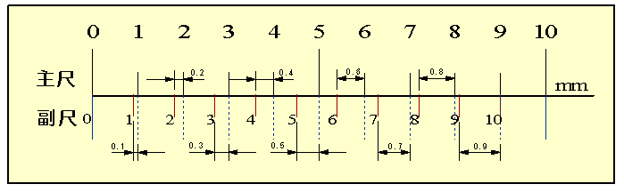 | ノギスの主尺は、1mm間隔の目盛りが付いている。副尺(バーニヤ)の長さは19mmで20目盛りが記されている。図で説明したように、主尺と一致する副尺の目盛りの読みが1mm以下の値となる。 何故このようになるのかを説明します。図5のように1mmの最小目盛り、長さ10mmの主尺を考えます。副尺は長さ9mmで10等分の目盛りを有します。副尺1目盛りは、0.9mmの長さになります。主尺と副尺の0点を合わせると、主尺の1目盛目と副尺の1目盛目との間には、0.1mmずつのずれが生じ、副尺の値が増えるとずれ量は ずれ量mm=副尺の目盛り×0.1mm となります。そして、副尺10目盛りでずれ量が1mmとなり、主尺目盛り9mmと副尺10目盛りが一致します。 |