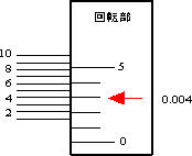 | ● | 送り部ねじのピッチ(シンブル1回転でスピンドルが進む距離)は 0.5mm 回転部最小目盛りである1目盛りの回転では、1/50回転であるので、測定部のスピンドルの移動距離は 0.5mm×(1/50) = 0.01mm 回転部目分量で識別できる大きさは、人間の目は最小目盛りの1/10まで識別可能であるので、回転部最小目盛りの更に1/10であり、この回転量は 測定部スピンドルの移動距離 0.01mm×(1/10) = 0.001mm に相当する。 【マイクロメーターでは 0.001mmまで測定可能】 |