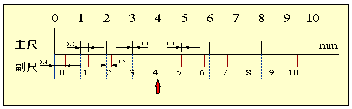 | 次に、図6のように、副尺の目盛り0を0.4mmタだけ右にずらす位置にします。副尺の目盛り間隔は0.9mmであるので主尺と副尺の1の目盛りは0.3mm、2の目盛りは0.2mm、3の目盛りは0.1mmのずれを生じ、4の目盛りは0mmで一致します。5の目盛りは、0.1mm,6の目盛りは0.2mmとずれは増加してゆきます。更に詳細を図7に示します。 | ||||||||||