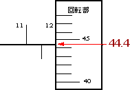 | (2). | 試験片直径が12mmよ小さいとき 図2(c) 固定軸の基準線より、シンブルの0の位置が上,12mm目盛りが見えない。 固定軸の読みは、 11.5mm 基準線が指す回転部の目盛りの値は、44.4 (目分量は0.4 0.004mm ) 11.500 + 0.444 11.944 |